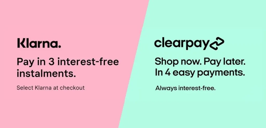 Klarna and Clearpay are credit companies that work with us to help you split the cost of your payments. They offer a range of options, including Buy Now, Pay in 30 Days, Pay in 3 Monthly Instalments and Pay in 4 Fortnightly Instalments.